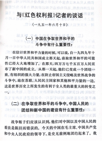 1951年6月10 日,宋庆龄和捷克斯洛伐克《红色权利报》记者谈话时指出:中国 “史无前例地团结起来了。我们的人民从来没有像今天这样充满热爱祖国的情绪……团结起来的中国一天天更加强大起来,一天天加强了和平阵营。”