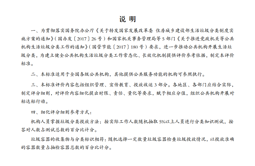 为指导公共机构开展生活垃圾分类工作,国管局编制了《公共机构生活垃圾分类工作评价参考标准》(以下简称《评价参考标准》)。各地区要结合工作实际,制定评分细则,明确达标要求,组织本地区公共机构通过自我评价等方式完善工作措施,形成推进垃圾分类工作的常态化、长效化机制;结合工作进展情况,定期对本地区公共机构生活垃圾分类工作开展监督检查,不断提高工作成效。各部门要根据《评价参考标准》,开展经常性对照检查,推动工作落实,发挥表率作用。